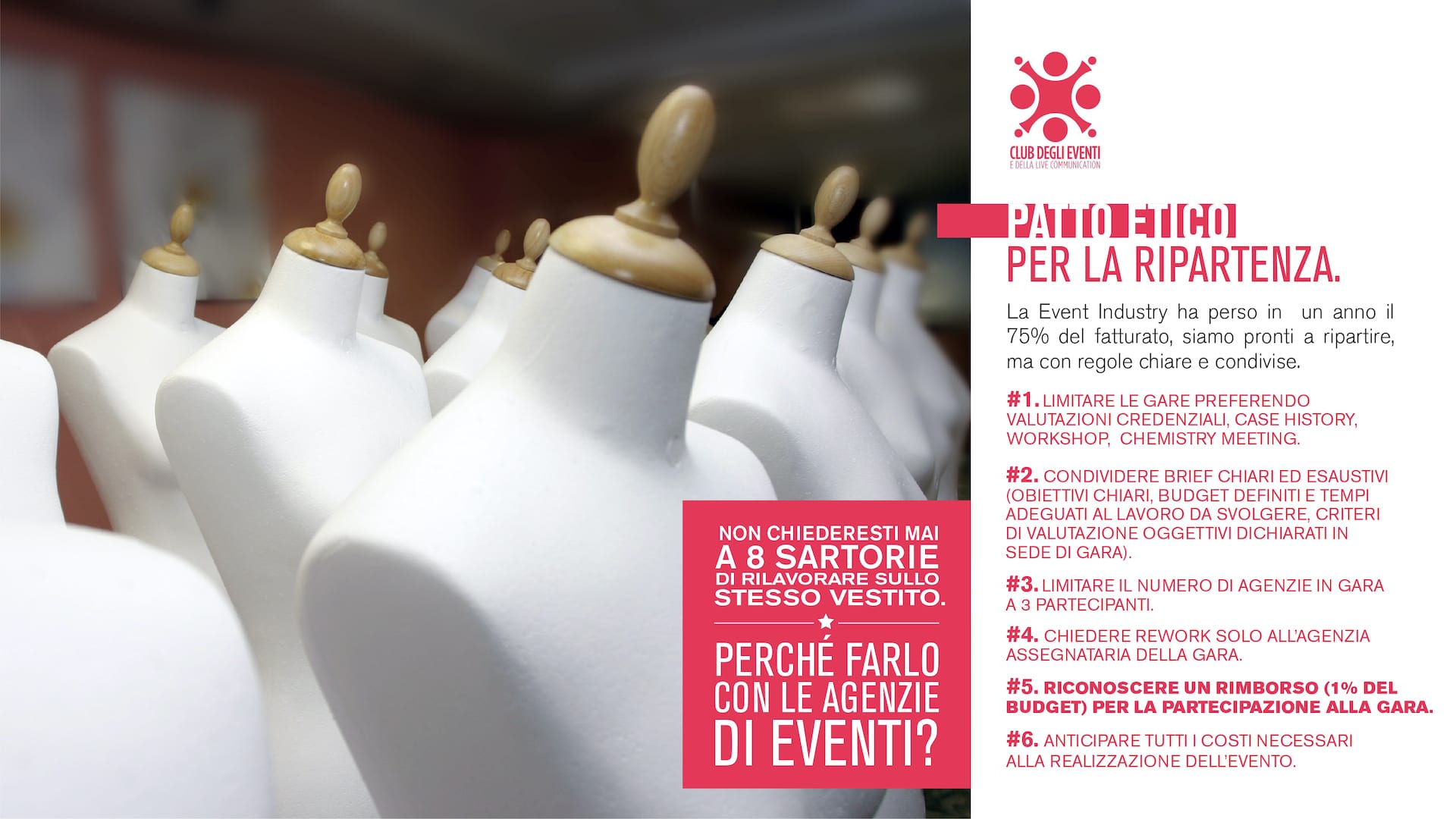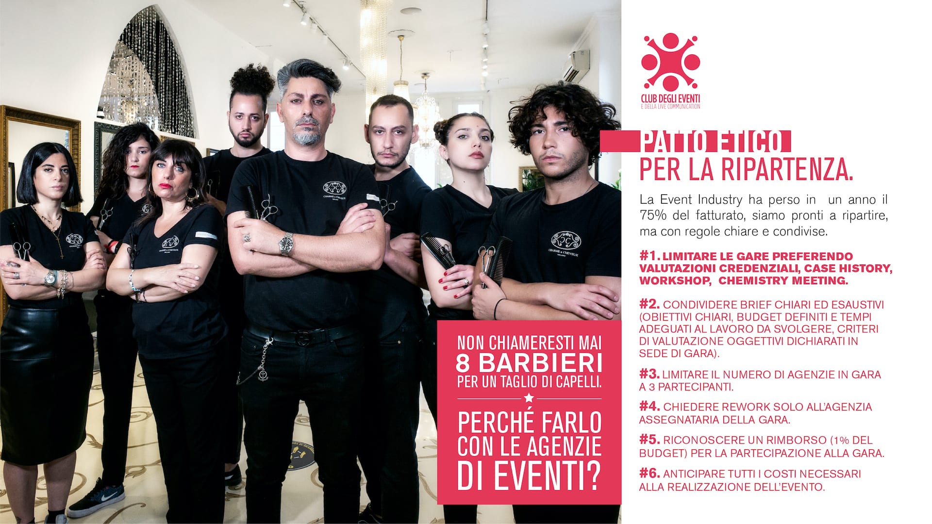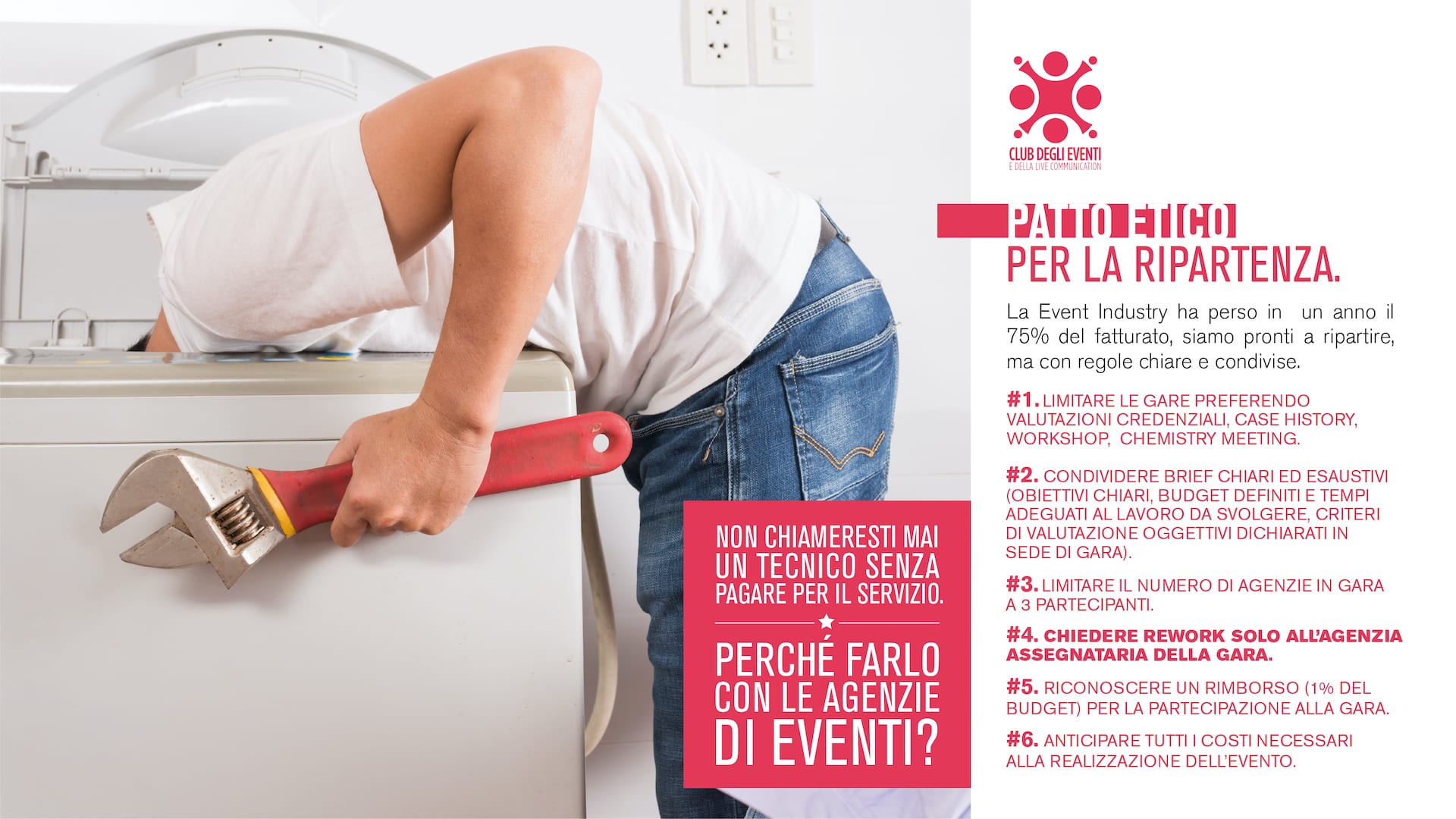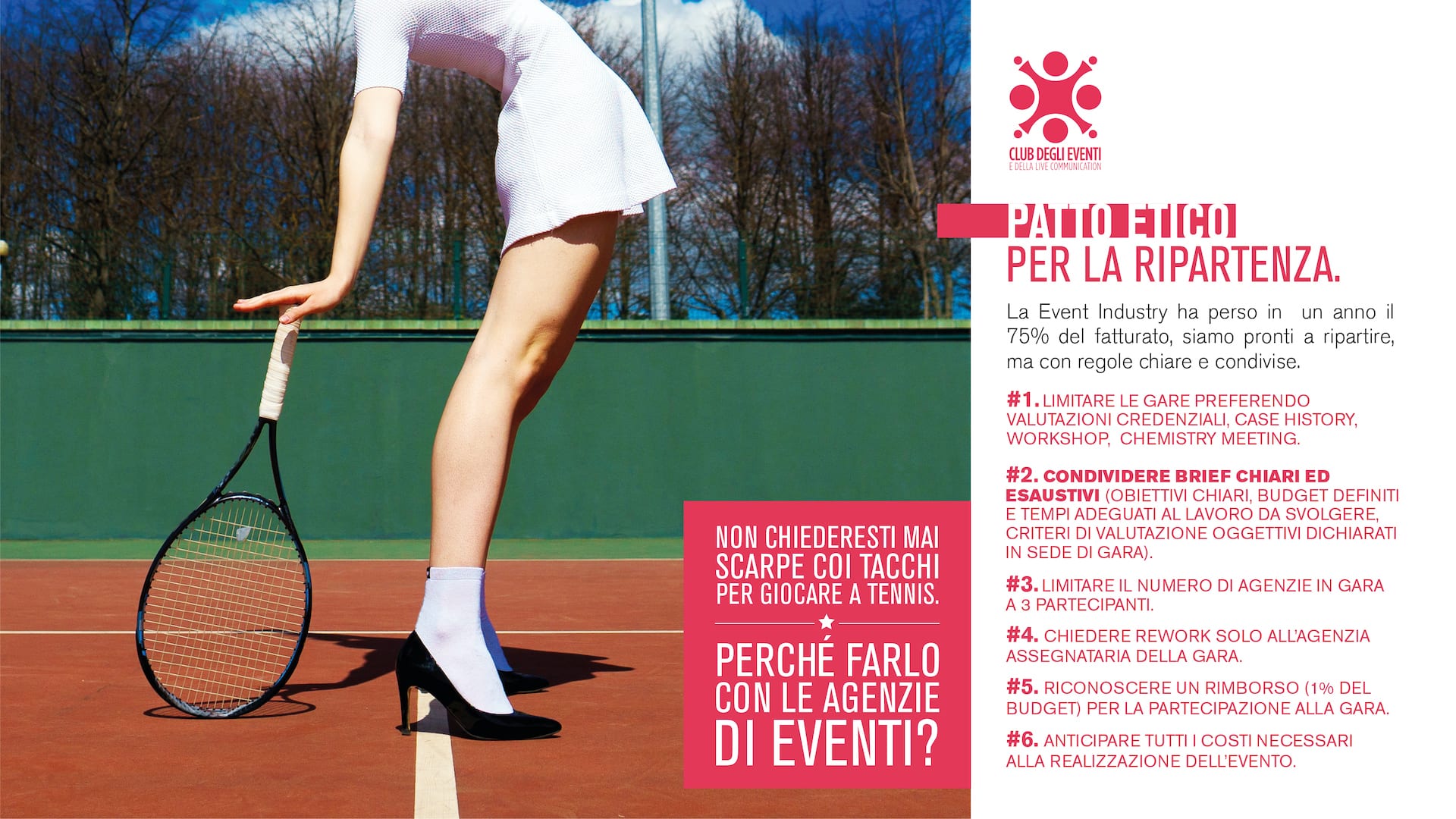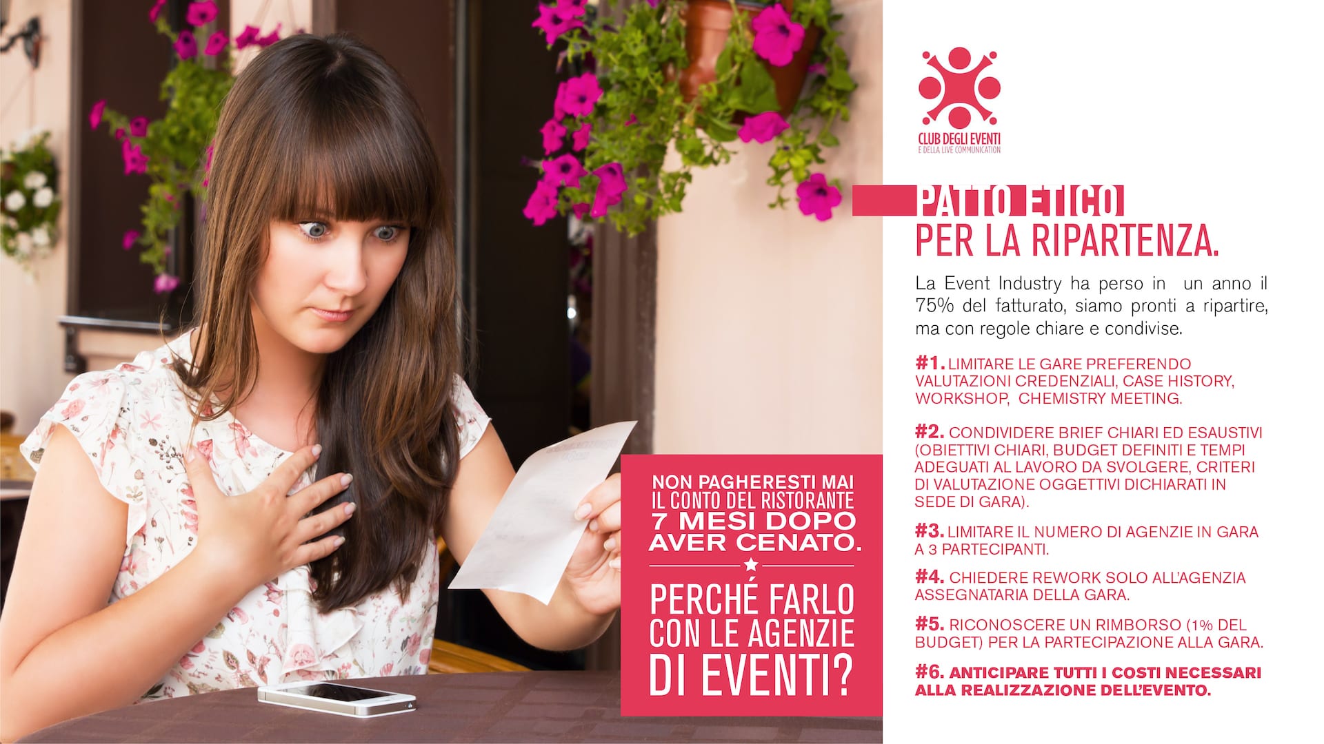 The message that the Ethical Pact wants to communicate is to understand and respect the value of creativity and services that event agencies make available to their clients. The 6 points proposed by the pact are intended to be a guide to define a correct relationship on both sides.