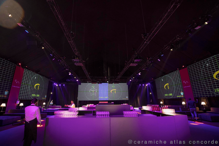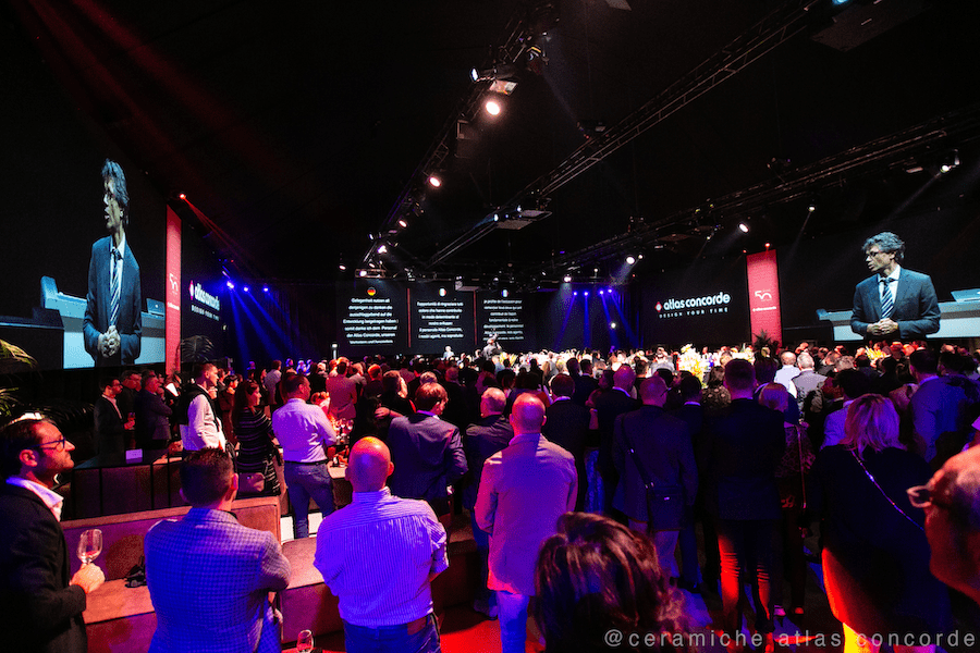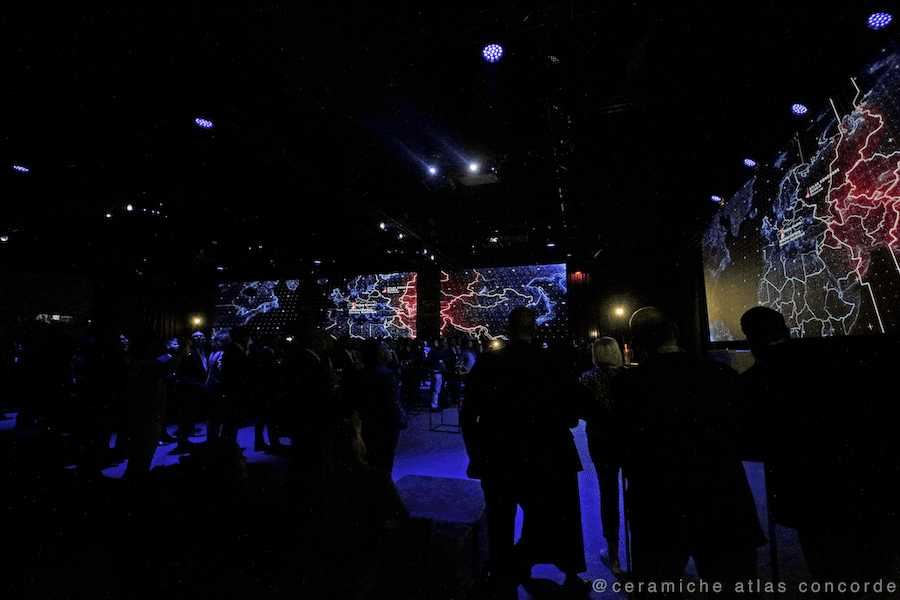 The most evocative moment of the evening arrived when the guests were gathered in the marquee to watch an emotional video on the history and values of the Atlas Concorde brand. The projection took place in multivision on 7 giant screens.