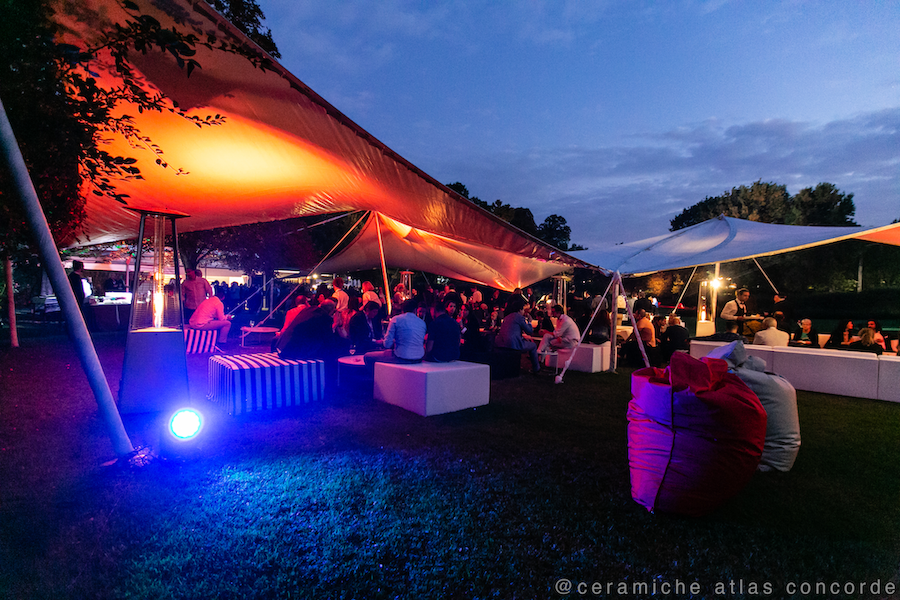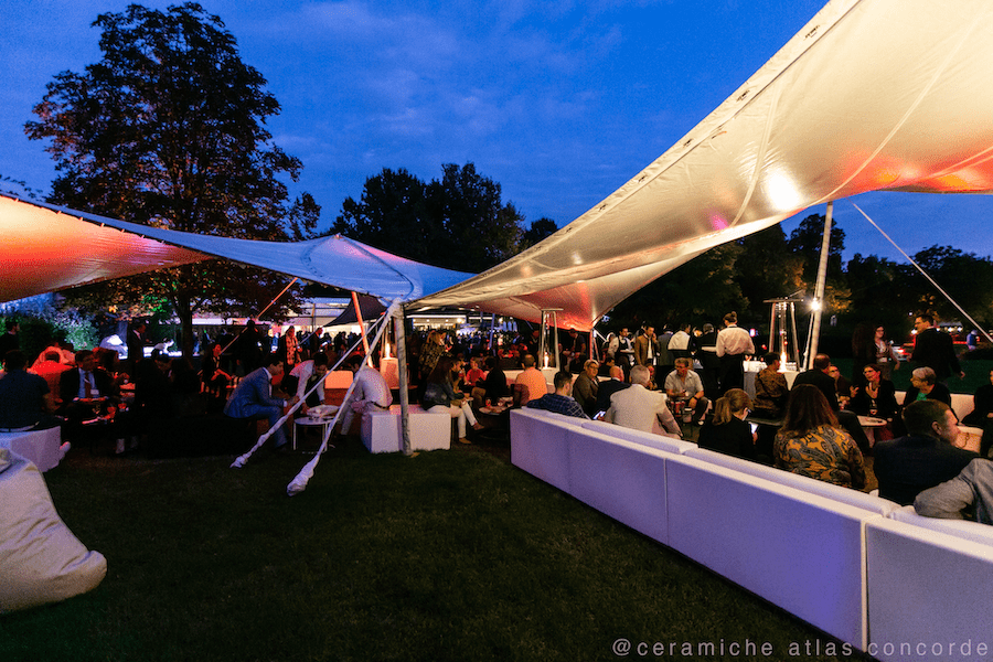After the guided tour inside the production plant, the guests were invited to spend the evening at Villa Casino Vicini in the Modena countryside. The villa’s large park was used to place a temporary marquee designed specifically for the event. Inside there were 2 large islands in central position and lounge rooms to accommodate all guests on each side.