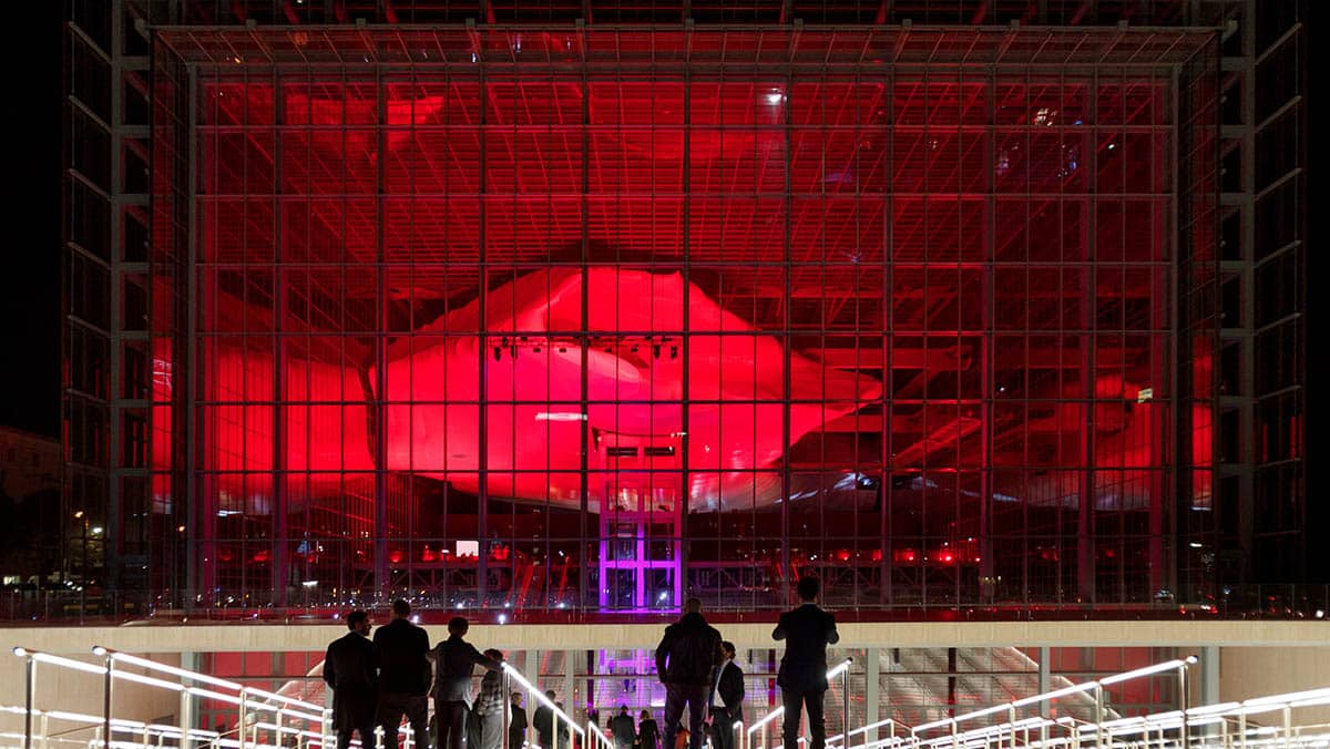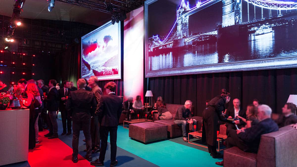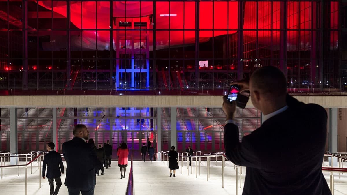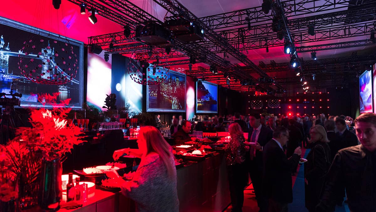 The lighting and interior design created for this event highlighted the architectural elements of this highly exclusive venue. The Rome Convention Centre was lit to exalt the impressive cloud structure seen through the massive exterior windows. The entrance ring was in laminated brushed gold with all rooms visible from the exterior through transparent crystal walls.