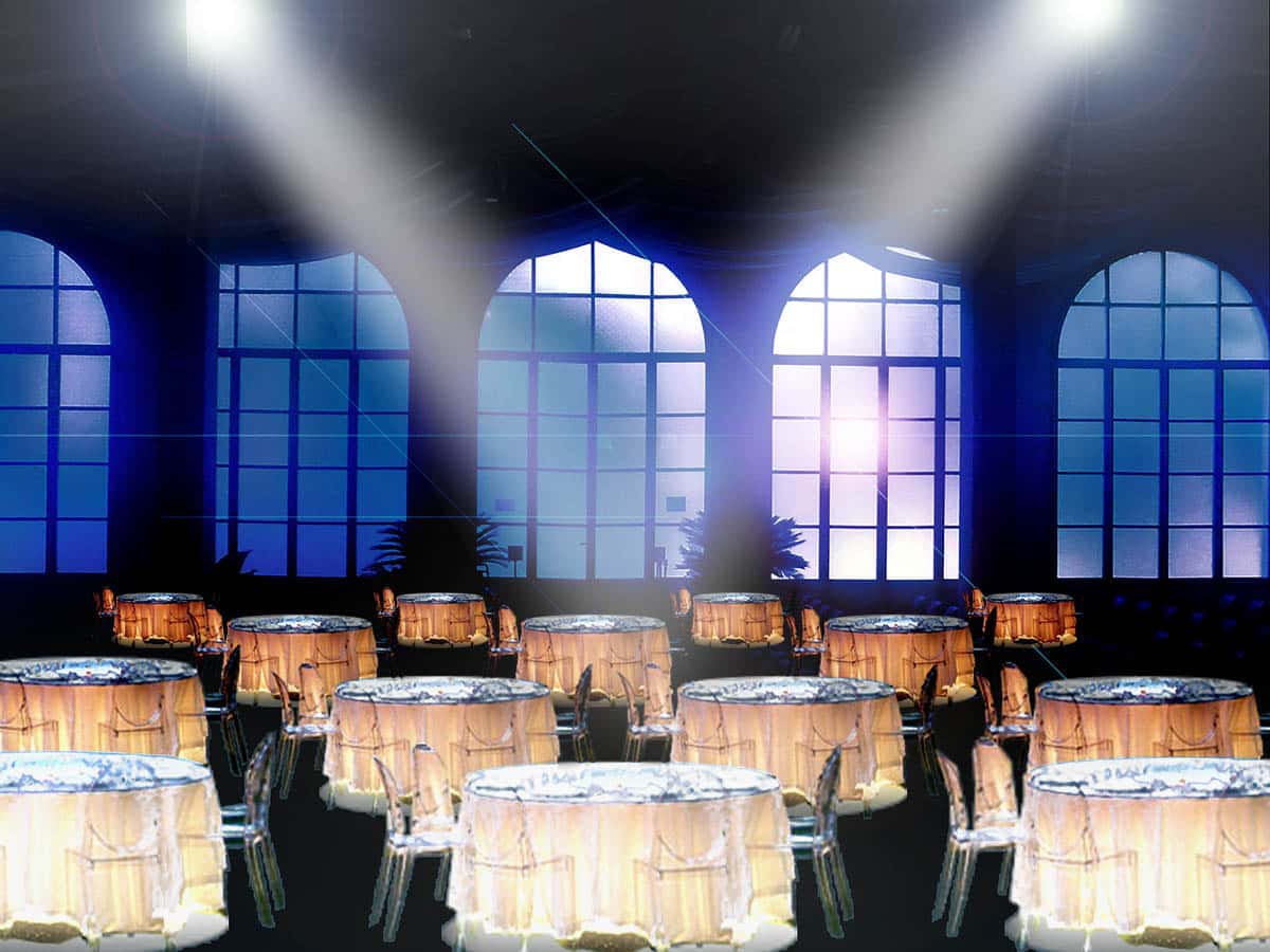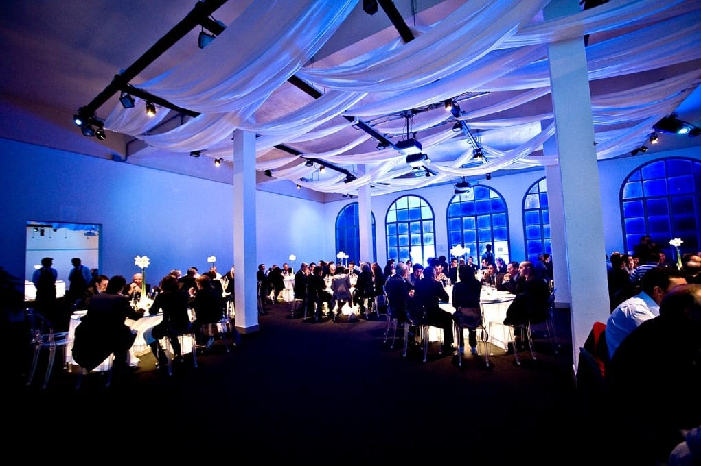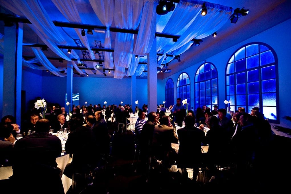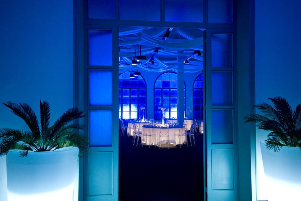 The interior design for the evening was entirely produced by Genius Progetti including under-lit tables with top-projected lights, floral centerpieces, fabric ceiling covers, custom gazebos and personalized emotional videos that were shown throughout the dining halls for an elegant yet professional setting.