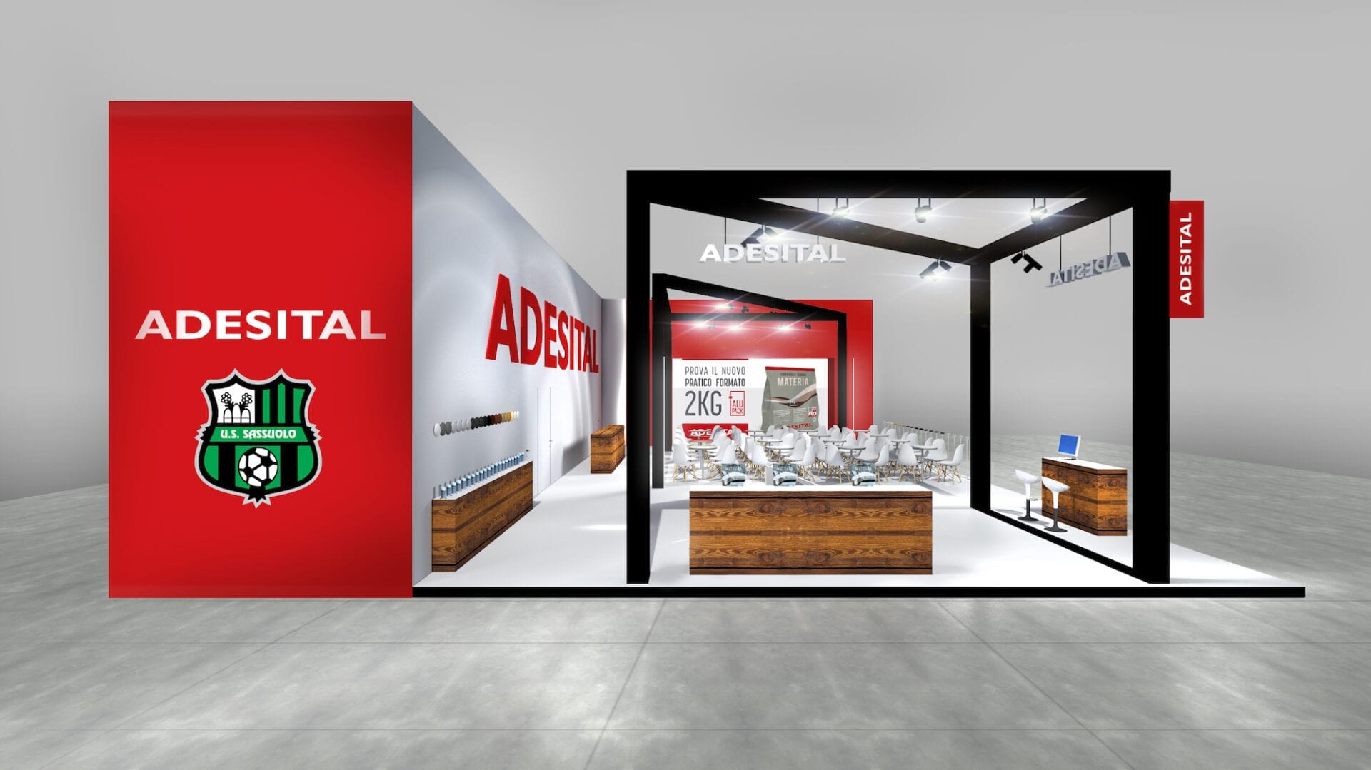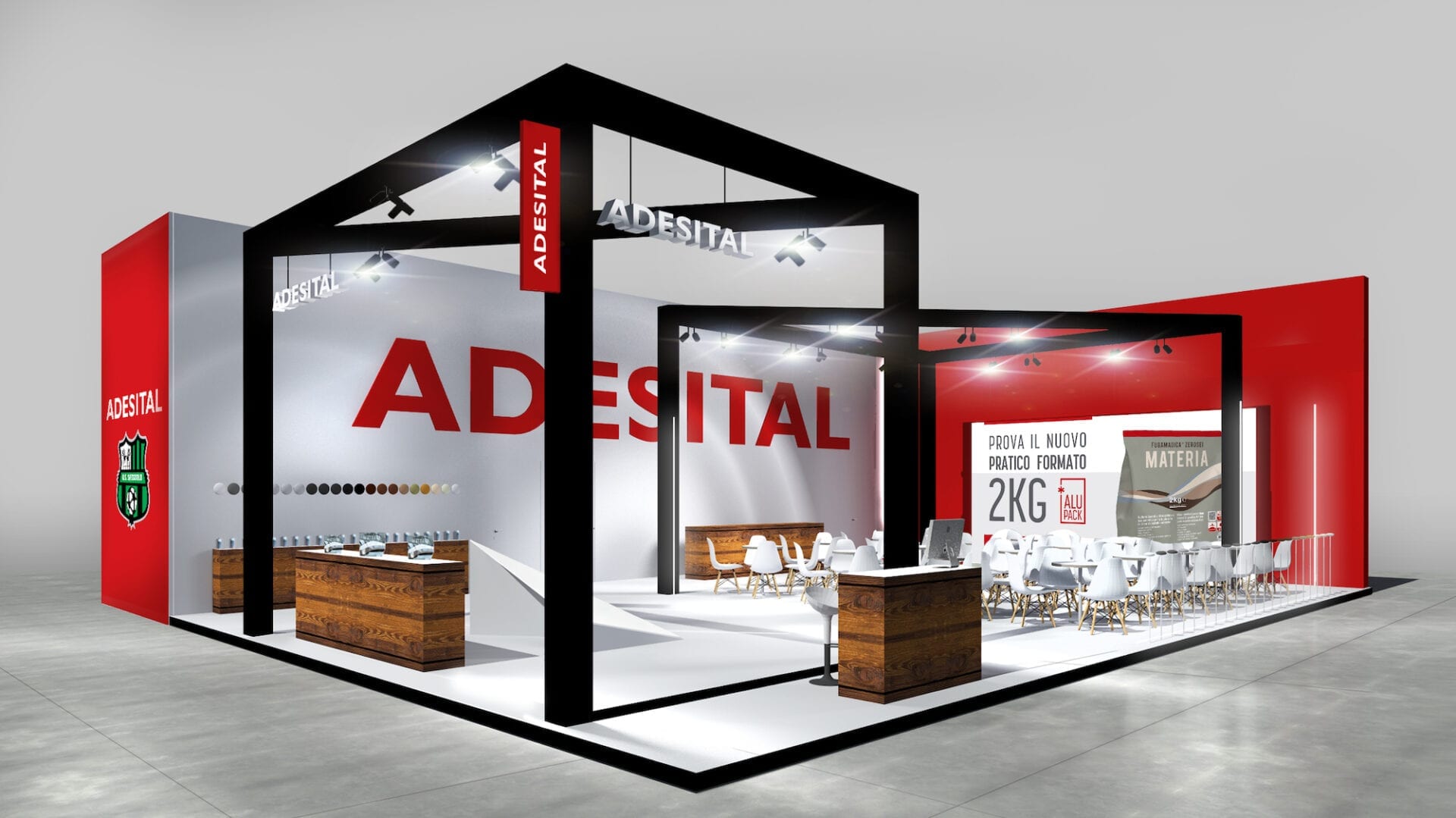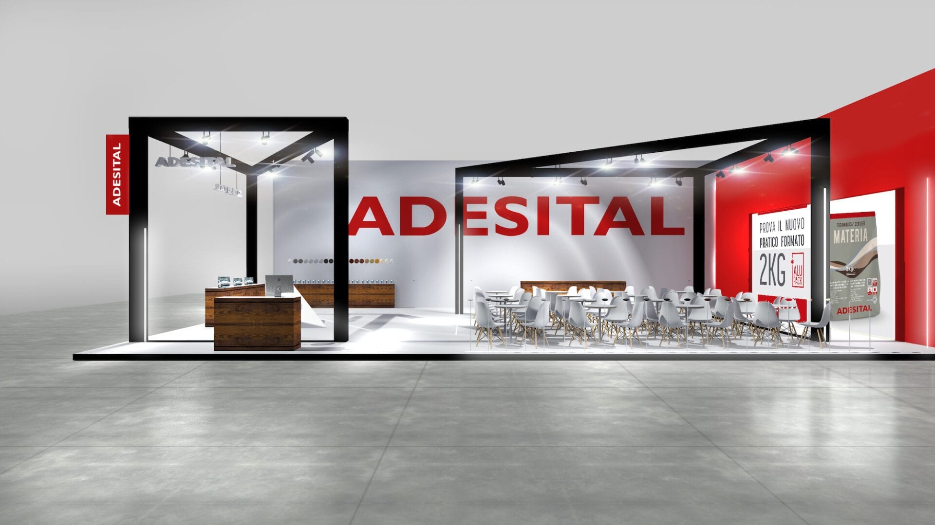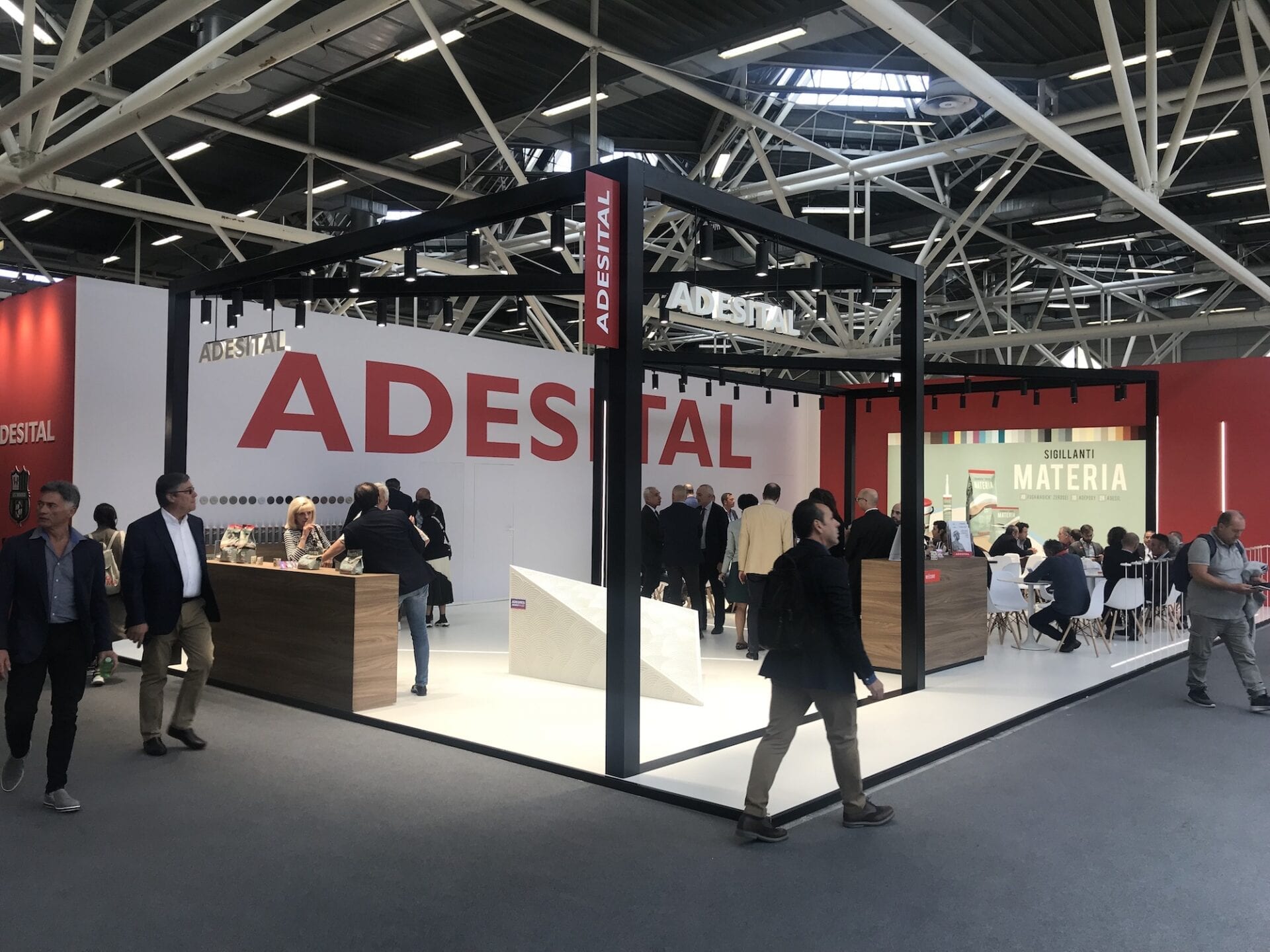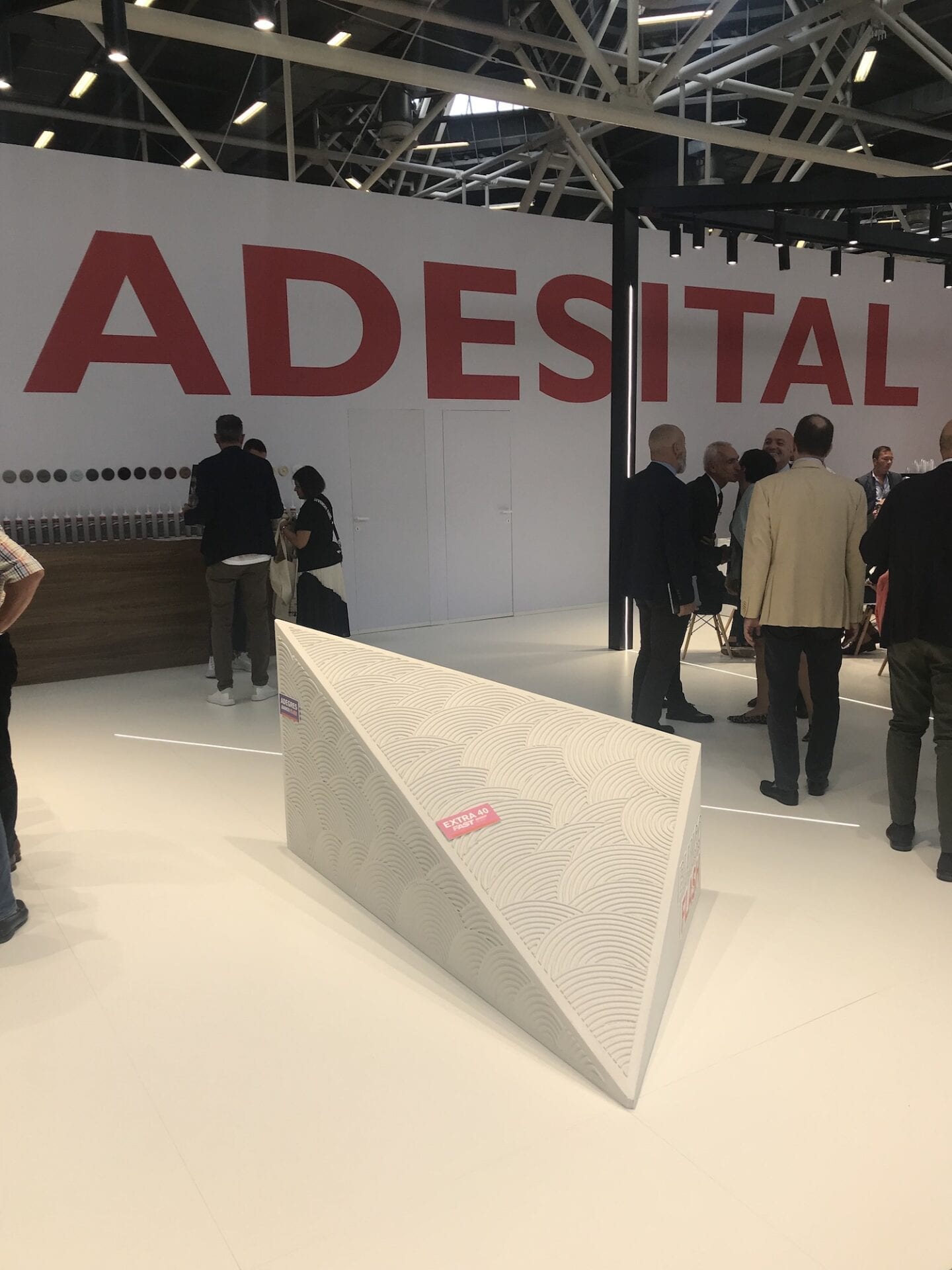 As additional support, in addition to the various display stands, we have created a prism decorated with Adesital white cementitious adhesive: a modern and unique detail that embellished the display area by making one of the brand’s leading products a real piece of furniture.
