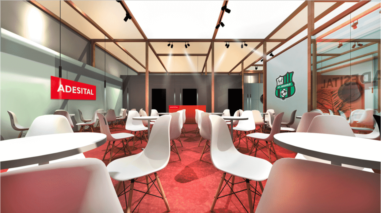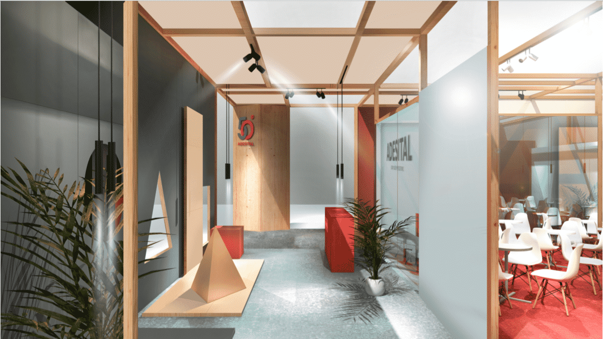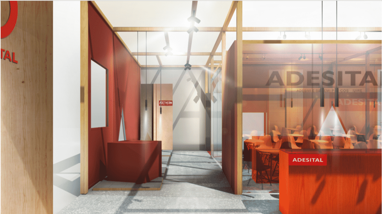 The stand we designed reflected all the needs of Adesital in terms of exhibition space and office space. There was also a bar counter and an equipped kitchen, as well as a large restaurant area with tables and seating for the guests of the stand.