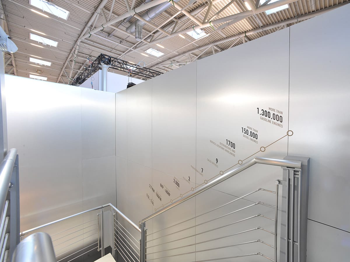 The adaptation of “The Light Box” for Bauma resolved a request from the client to have more working and meeting space due to the fact that this fair is the most visited. Thanks to the height of the ceiling we were able to create a private meeting room on the second floor and a storage space under the stairs. The stairway was also decorated with a timeline showing the history of the company, while the first floor housed the product and technical displays and a cafè.