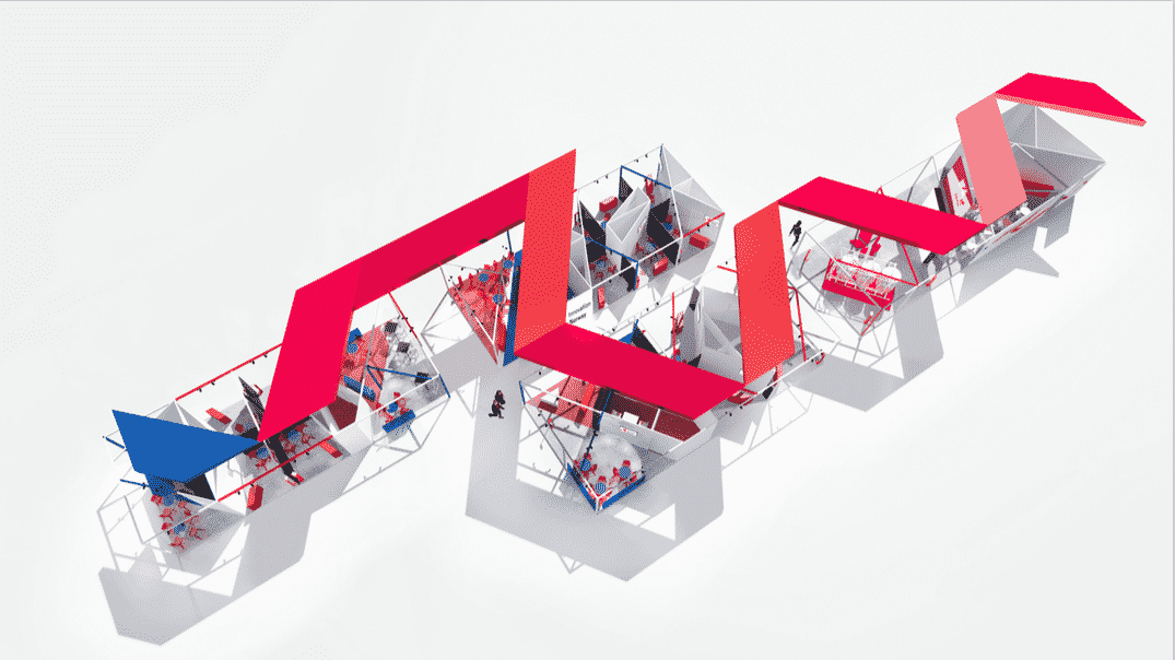 Our client request was simple: we had to develop a concept that met the available budget and capable of integrating a multitude of different companies with a multitude of areas and functional spaces. What we have realized was a concept that presented a unifying design leading the visitor through all blocks of the pavilion space.